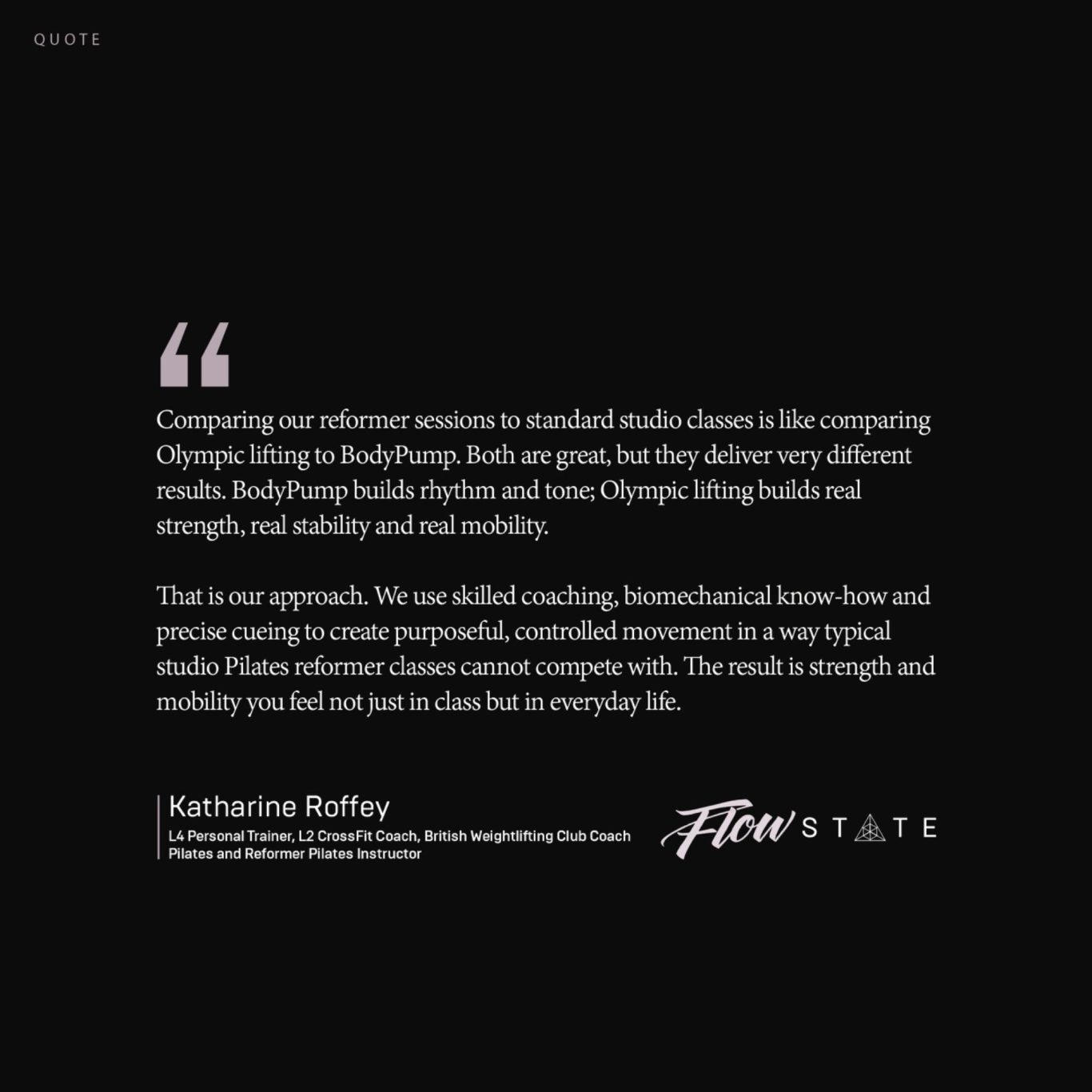 Precision, power, and transformation Step onto the Reformer and experience movement like never before with us. Reformer Pilates allows you to sculpt your body with precision and control. This dynamic practice challenges your strength, coordination, and flexibility in equal measure, creating long, lean muscles and a powerful core. Each session is a blend of resistance training and mindful flow, engaging muscles you never knew you had. Perfect for those seeking intensity without impact, it’s a transformative journey that enhances posture, builds functional strength, and supports joint health. Flowstate Reformer Pilates isn’t just exercise - it’s intelligent movement that empowers you from the inside out.